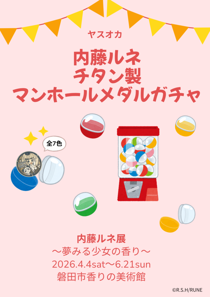 さらに本展では全7色!ヤスオカの内藤ルネマンホールメダルのガチャガチャが登場